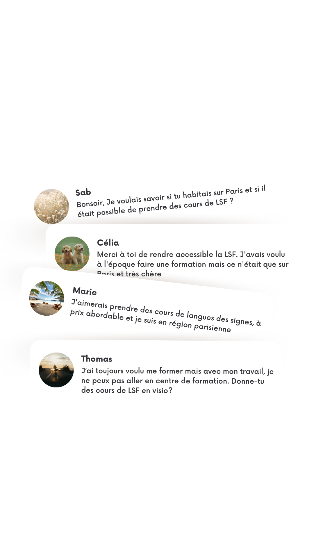 "Ta formation est géniale et en tant que sourd, ça fait plaisir de voir qu’il y a vraiment les bases de la LSF, y’a tous les éléments importants. Les modules sont très riches, complets et clair. Franchement, si j’étais entendant et que je voudrais apprendre la LSF, j’irais m’inscrire à ta formation sans hésiter, de par la richesse des programmes et aussi le prix accessible"